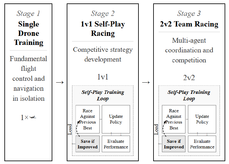 Figür 3: SPIRAL: önce temel kontrol, ardından self-play döngüsüyle 1v1’den 2v2 takım yarışına kademeli geçiş.