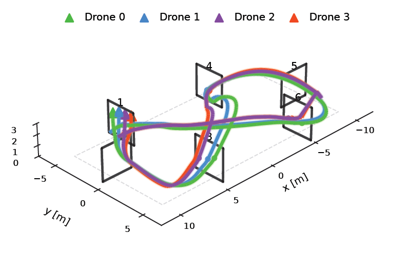 Figür 4: CRUISE ile eğitilmiş dört drone’un Sekiz (Figure‑Eight) pistindeki örnek yörüngeleri (6 kapı, kesişen döngüler)