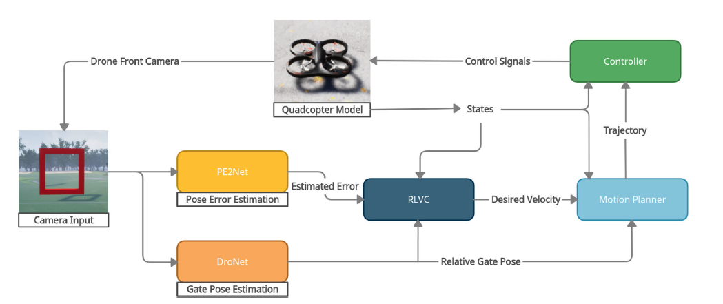 Figür 1: Önerilen sistem akışı: ön kamera girdisinden DroNet (kapı pozu) ve PE2Net (poz hata kestirimi); RLVC ile hız komutu üretimi ve hareket planlayıcıya entegrasyon.